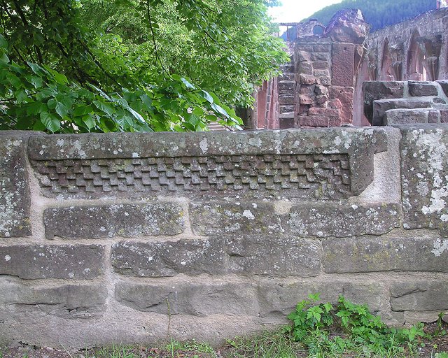 32 Hohenurach The checkerboard stone of Hohenurach (slate roofing in stone?). Similar ornamental stones can be found in the basilica of Hirsau. The rest is conjecture. Surplus store acquisition, the traveling stone salesman at the door, medieval souvenir hunting or, more daring, an intertwined building history (Mettler speculation, 1922). Some dating problems. The shown checkerboard stone is part of the Gothic window of the previous picture. Curtain rail position. Best guess: master bedroom or chapel. (The info board shows an external chapel but the latter dates only from 1662.) There are no other matching stones in Hohenurach. Nearly a symmetry violation. (I am nearly certain that somebody did already check the heap of bric-a-brac stones in front of the main gate.)